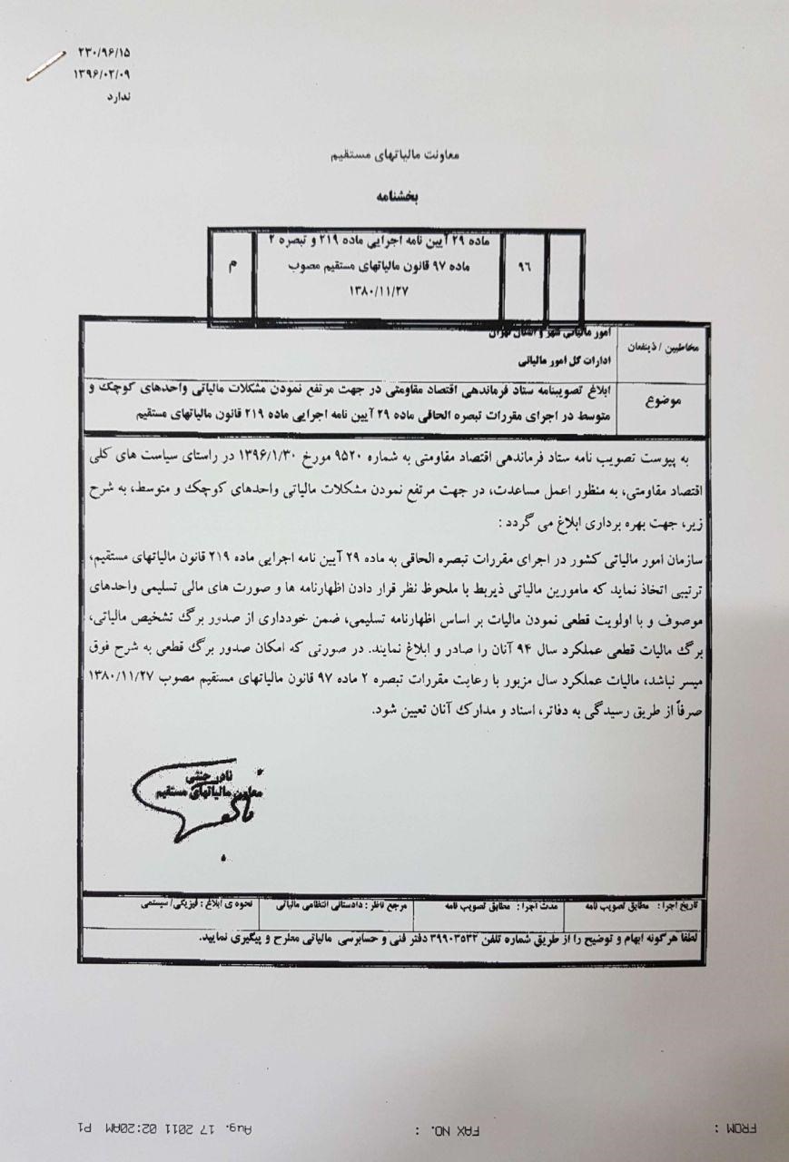 سازمان امور مالیاتی کشور در اجرای مقررات تبصره الحاقی به ماده ۲۹ آیین نامه اجرایی ماده۲۱۹ قانون مالیاتهای مستقیم ترتیبی اتخذ نماید که مامورین مالیلاتی ذیربط با ملحوظ نظر قراردادن اظهارنامه ها و صورت های مالی تسلیمی واحدهای موصوف و با اولویت قطعی نمودن مالیات براساس اظهارنامه تسلیمی، ضمن خوداری از صدور برگ تشخیص مالیاتی، برگ مالیات قطعی عملکردسال۹۴ آنان را صادر و ابلاغ نمایند.درصورتی که امکان صدور برگ قطعی به شرح فوق میسر نباشد، مالیات عملکرد سال مزبور با رعایت مقررات تبصره ۲ ماده ۹۷ قانون مالیاتهای مستقیم مصوب ۱۳۸۰/۱۱/۲۷ صرفا از طریق رسیدگی به دفاتر، اسناد و مدارک انان تعیین می شود.