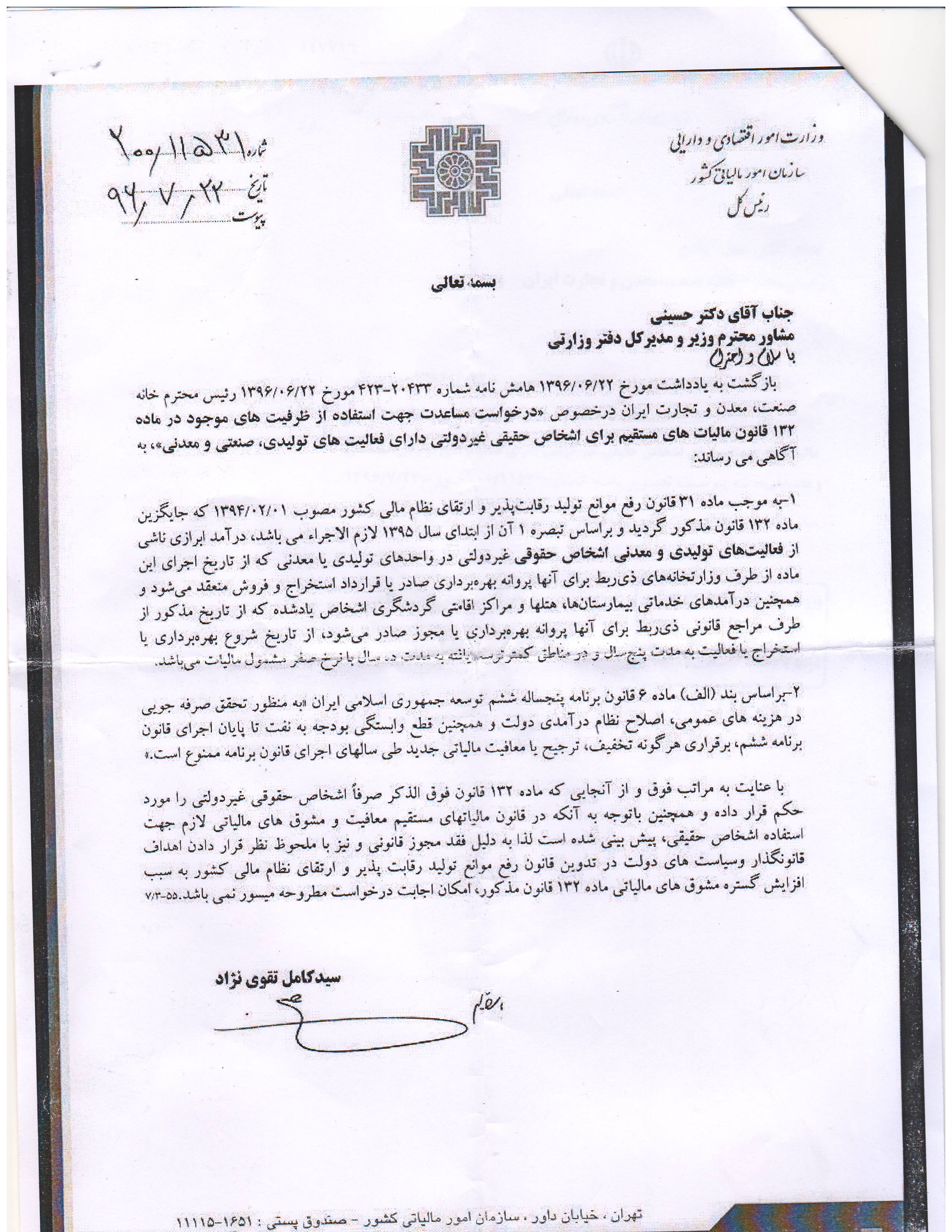 استفاده از ظرفیتهای موجود در ماده132 قانون مالیات های مستقیم برای اشخاص حقیقی غیردولتی دارای فعالیت های تولیدی، صنعتی و معدنی مدیریت وب سایت 1396-08-15 اخبار, اطلاعیهها 555 بازدید نوشته های مرتبط برگزاری مجمع عمومی عادی به طور فوق العاده خانه صنعت،معدن و تجارت استان تهران 3 روز پیش گزارش عملکرد خانه صنعت معدن و تجارت استان تهران 1403 5 روز پیش بسته حمایت از صنایع به گمرکات ابلاغ شد 10 روز پیش استفاده از ظرفیتهای موجود در ماده۱۳۲ قانون مالیات های مستقیم برای اشخاص حقیقی غیردولتی دارای فعالیت های تولیدی، صنعتی و معدنی به شرح زیر می باشد. 1396-08-15 مدیریت وب سایت