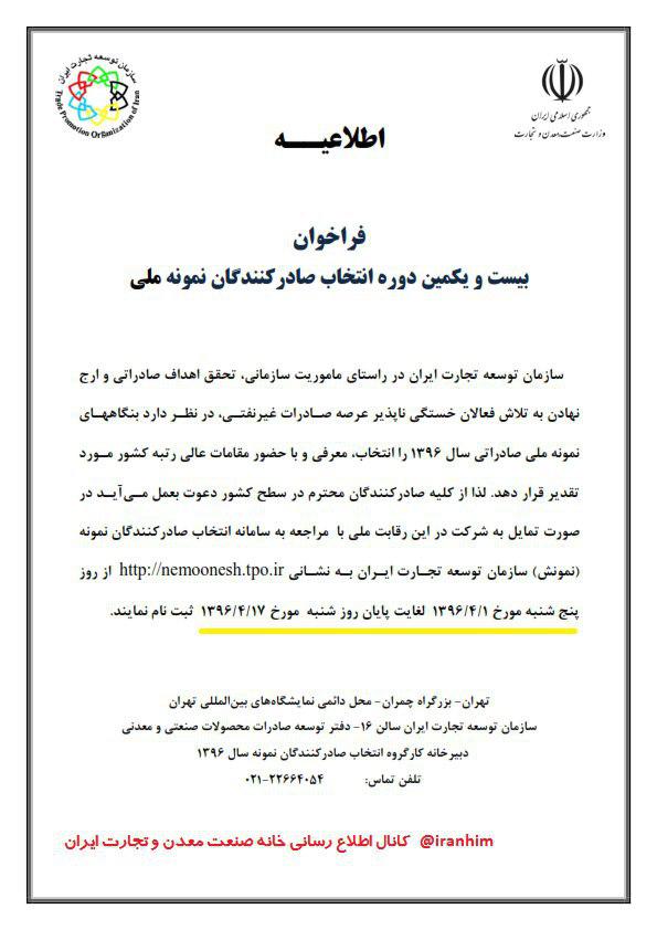 فراخوان بیست و یکمین دوره انتخاب صادرکنندگان نمونه ملی به شرح زیر می باشد: