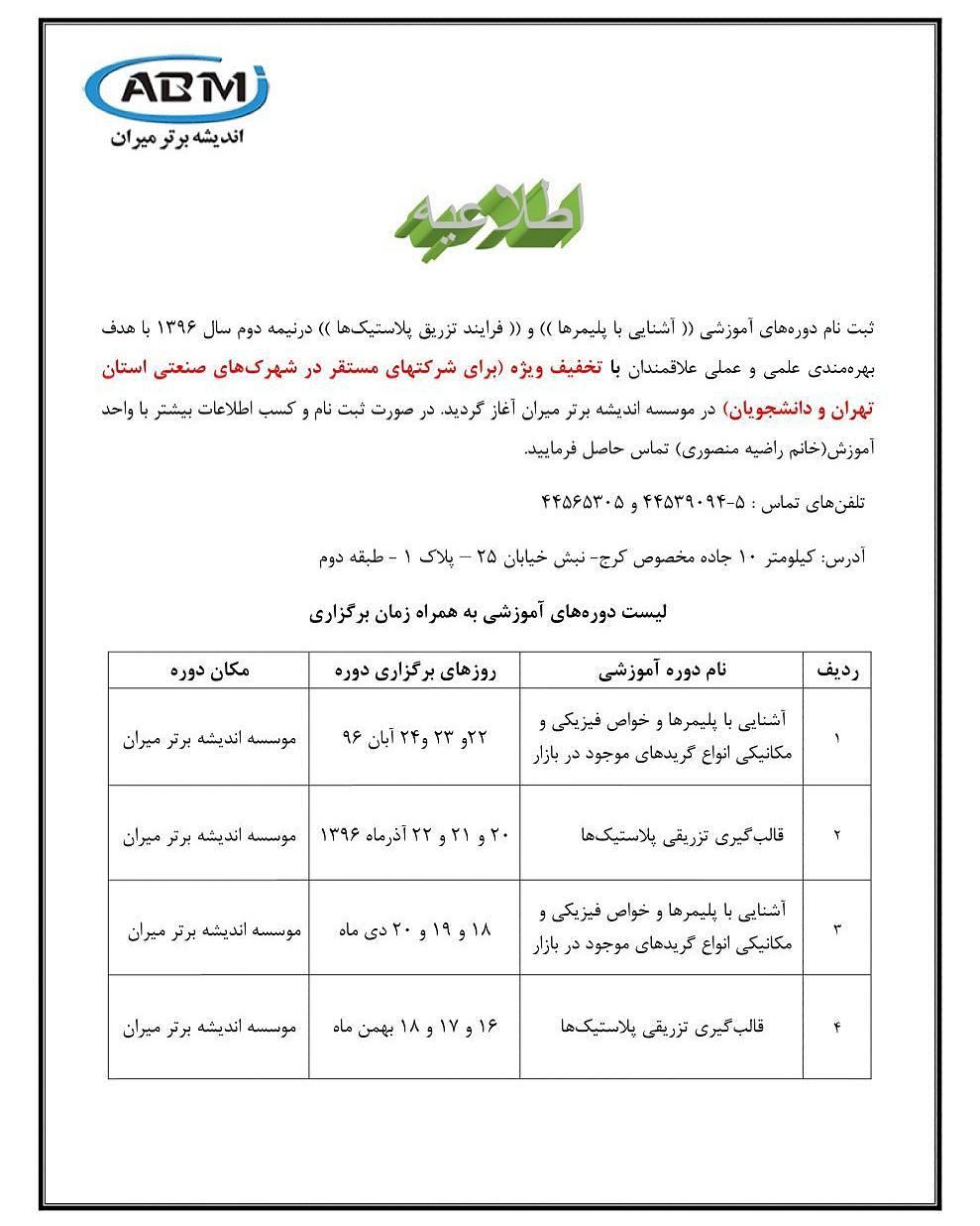 دوره های آموزشی ((آشنایی با پلیمرها)) و ((فرایند تزریق پلاستیکها)) با هدف افزایش بهره وری و ارتقا سطح دانش و توان نیروی انسانی در توسعه و پیشرفت فعالیت های واحدهای صنعتی و تولیدی برگزار می گردد.